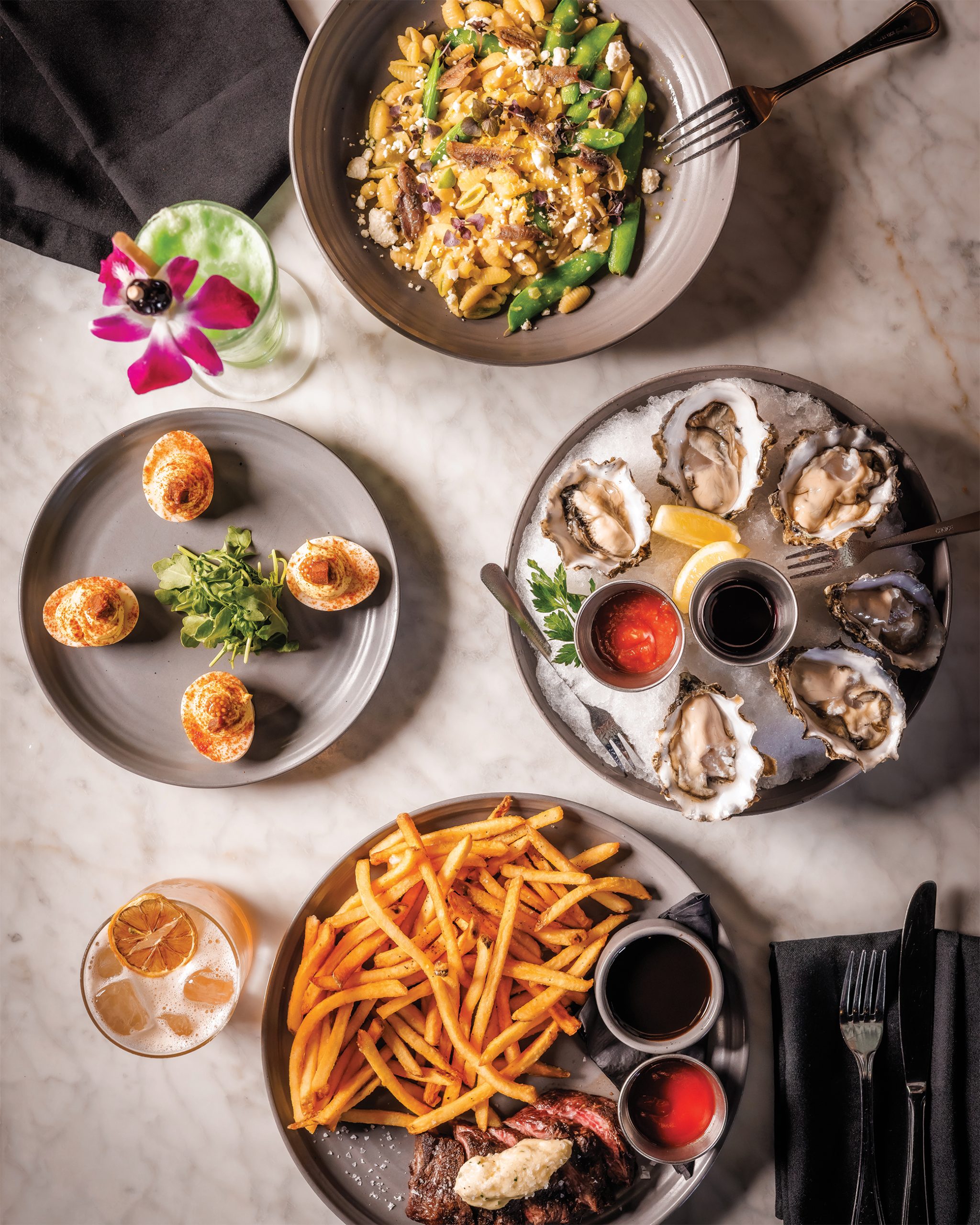 First up, we suggest enjoying your drinks over oysters—tiny West Coast beauties brightened with a blueberry mignonette that amplifies the melon-like sweetness of bivalves. It’s not flashy; it’s just absurdly good. Then come the deviled eggs with luxuriously silky smoked yolks, topped with crispy pork belly for texture and pickled mustard seed for bite. Next, the country fried blue oyster mushrooms from Jacob’s Mushroom (a local gourmet mushroom farm) are torn by hand into hefty chunks and fried to absolute golden, flaky perfection. Drag them through the smoked corn mornay (a tangy cheese gravy) and preserved lemon, and you’ll be coming back just for this dish.