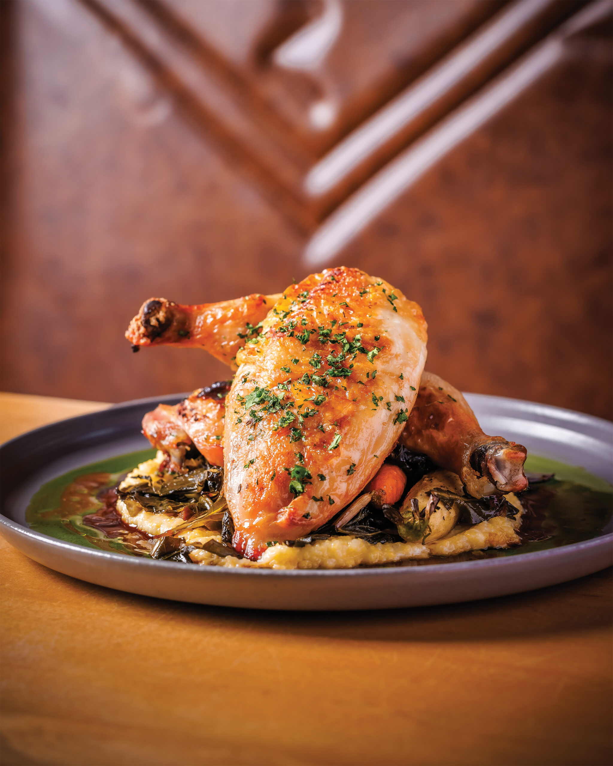 Now, the mains may look classic, but they hit with a depth of flavor that’s anything but ordinary. Take the squash cavatelli: umami-rich bonito flakes, whole anchovies, salty feta, parmesan, pecorino, and micro basil come together in a smoky, briny, herbaceous sauce that’s hard to pin down and impossible to stop eating. The roasted half chicken is a standout— far from the dry, uninspired version we often acquaint them with. This one is all dark meat (yes, please), set on smoky cheddar polenta with braised collard greens and carrots. It’s juicy, salty, and deeply comforting. Chicken as it should be. Same goes for the steak frites: crispy, thin fries, rich bone marrow butter, and well-seasoned arugula complement a delicate and balanced center cut. You know this plate—you just don’t know it like this. Opt for Worcestershire instead of ketchup for a garlicky kick.