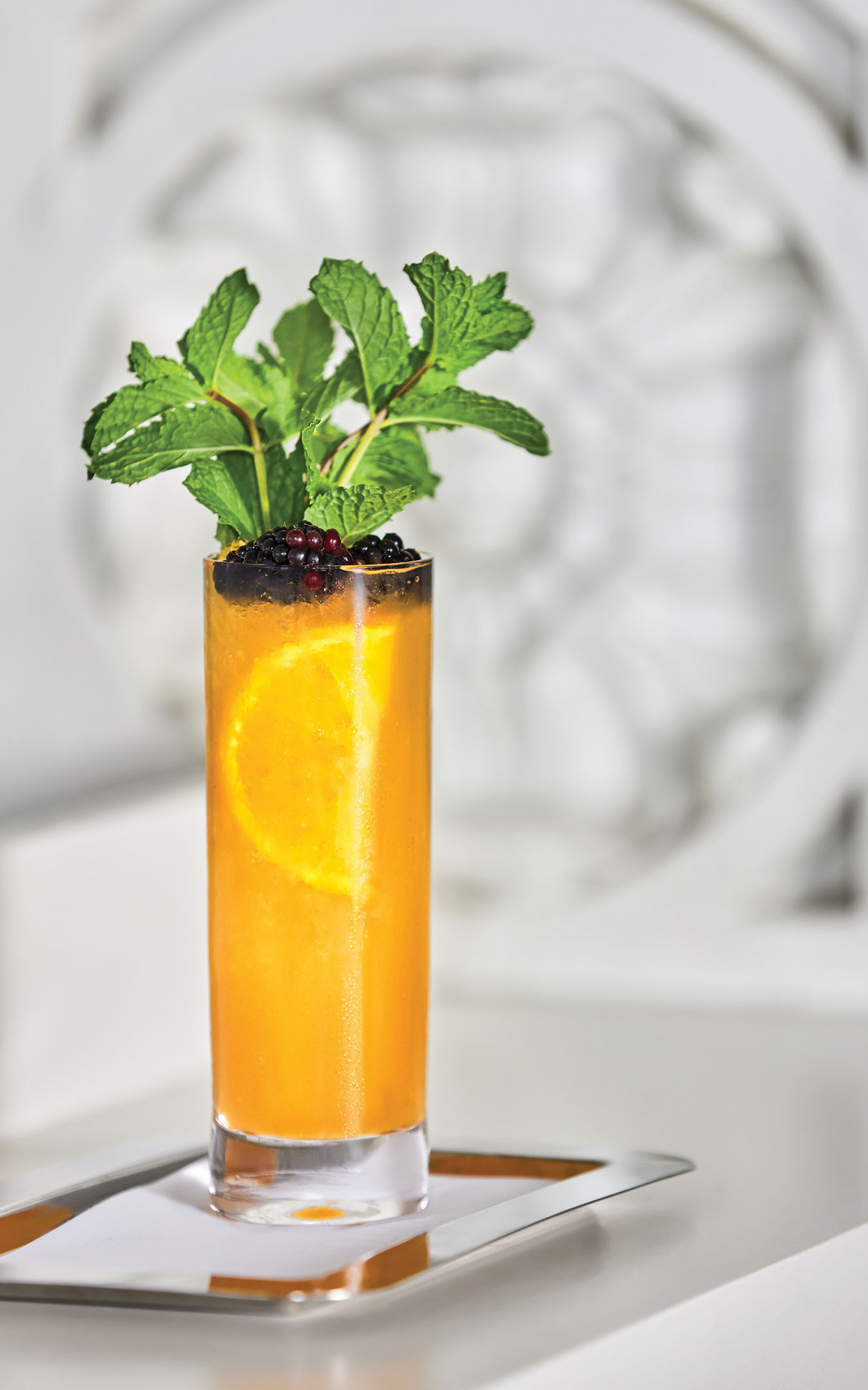 Shake and strain into a fine Collins glass filled with pebble ice. Garnish with mint bouquet, orange wheel, and seasonal berries. Enjoy!