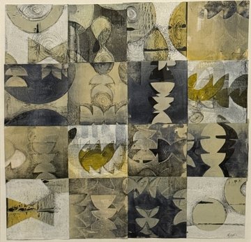 “Another Door Opens” explores the interplay between structure and spontaneity through abstract compositions created by dissecting and reassembling monoprints through collage. Repeating geometric patterns and grid forms provide architectural foundation, while references to blockprint techniques and handwritten marks introduce a human element that softens rigid structures.