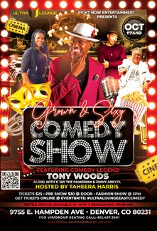 The Grown & Sexy Comedy Show, at Ultra Lounge East on Hampden Avenue, aims to bring style and class along with a cool vibe to local stand-up comedy. Featuring legendary comedian Tony Woods — seen on HBO, Comedy Central, and Def Comedy Jam. Also starring K-Jay the Comedian, a tall sexy drink of laughter who has appeared on BET, TMZ and Fox TV. With Jimmy Abeyta, who has delighted viewers on BET, MTV, and Latin Comedy Jam. And Denver’s sexy host, Teheera Harris, a bundle of laughter, rounds out the show.