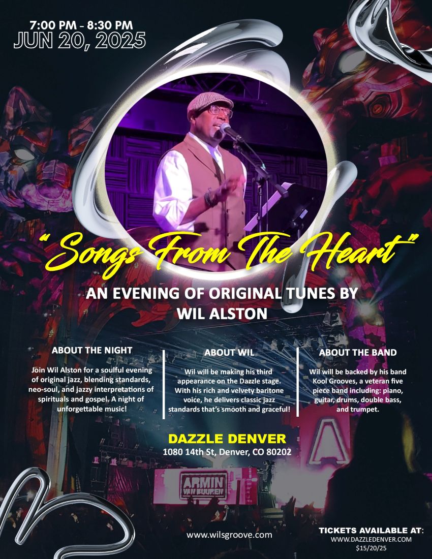 Join Wil Alston for an exciting night of original music in “Songs from the Heart.” This soulful performance will feature an all-original set that blends classic jazz, neo-soul, and jazzy interpretations of spirituals and gospel. Wil’s rich, velvety baritone voice brings a smooth elegance to every note, delivering his original compositions with heartfelt emotion. Backed by his talented five-piece band, Kool Grooves—featuring piano, guitar, drums, double bass, and trumpet—this will be a night of captivating music and powerful storytelling. Don’t miss Wil’s third appearance on the Dazzle stage for a truly unique musical experience!