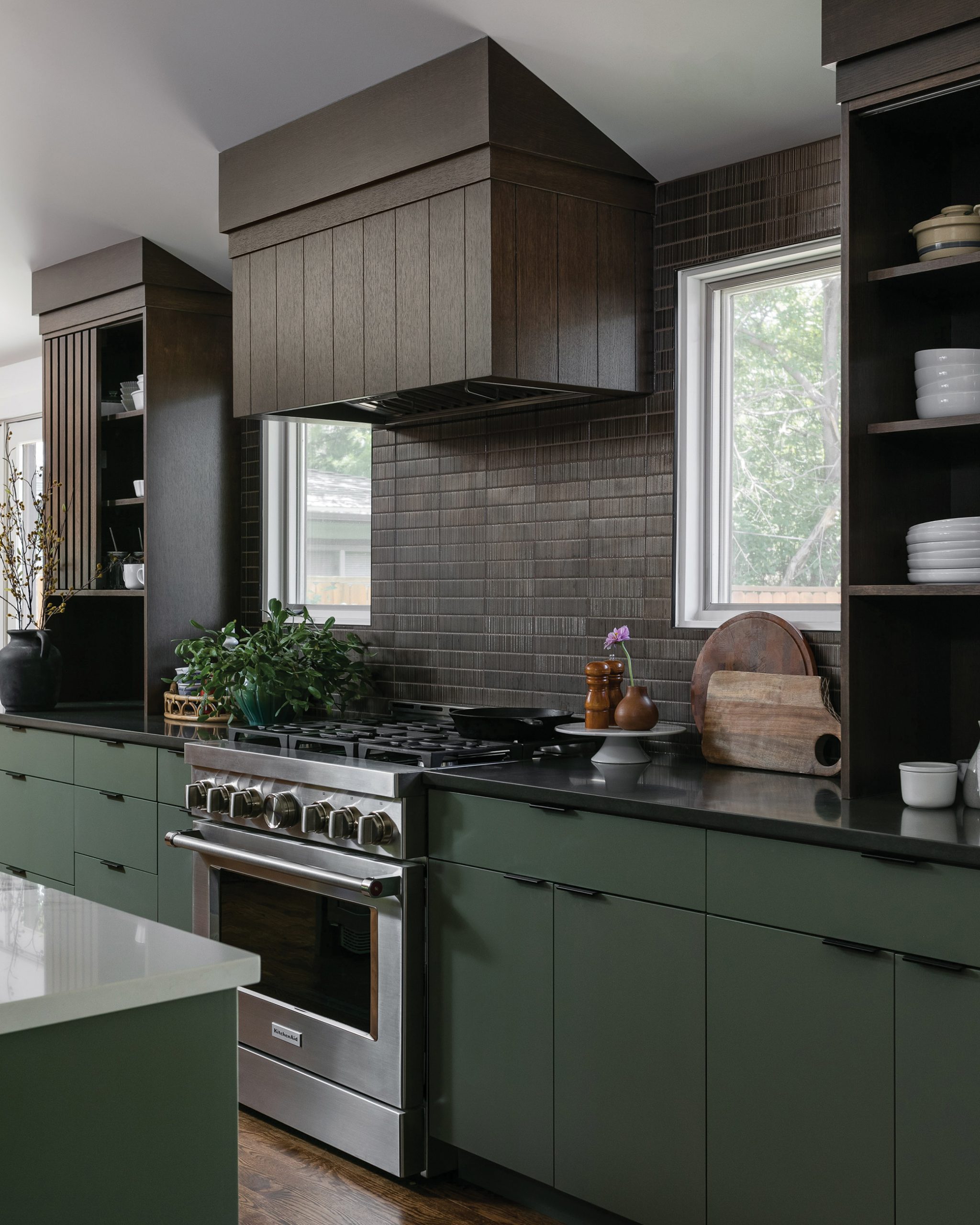 Obermann kept the kitchen consistent with the home’s mid-century style while emphasizing a natural connection. “We wanted the space to be beautifully basic—not rustic, but casually tailored using monochromatic principles focusing on a neutral masculine,” she explains. The cabinets, painted Sherwin-Williams’ Sage Green, provide a moody backdrop that grounds the space. A reflective bronze Savoy Ribbed Field Tile backsplash from Ann Sacks adds texture and depth, while slotted upper cabinets in Quarter Sawn White Oak bring airiness and movement to the space. A mix of woods—including chestnut, oak, rosewood, teak, and walnut—adds inviting warmth. The homeowners’ existing stools and ceramics provide the finishing touches.