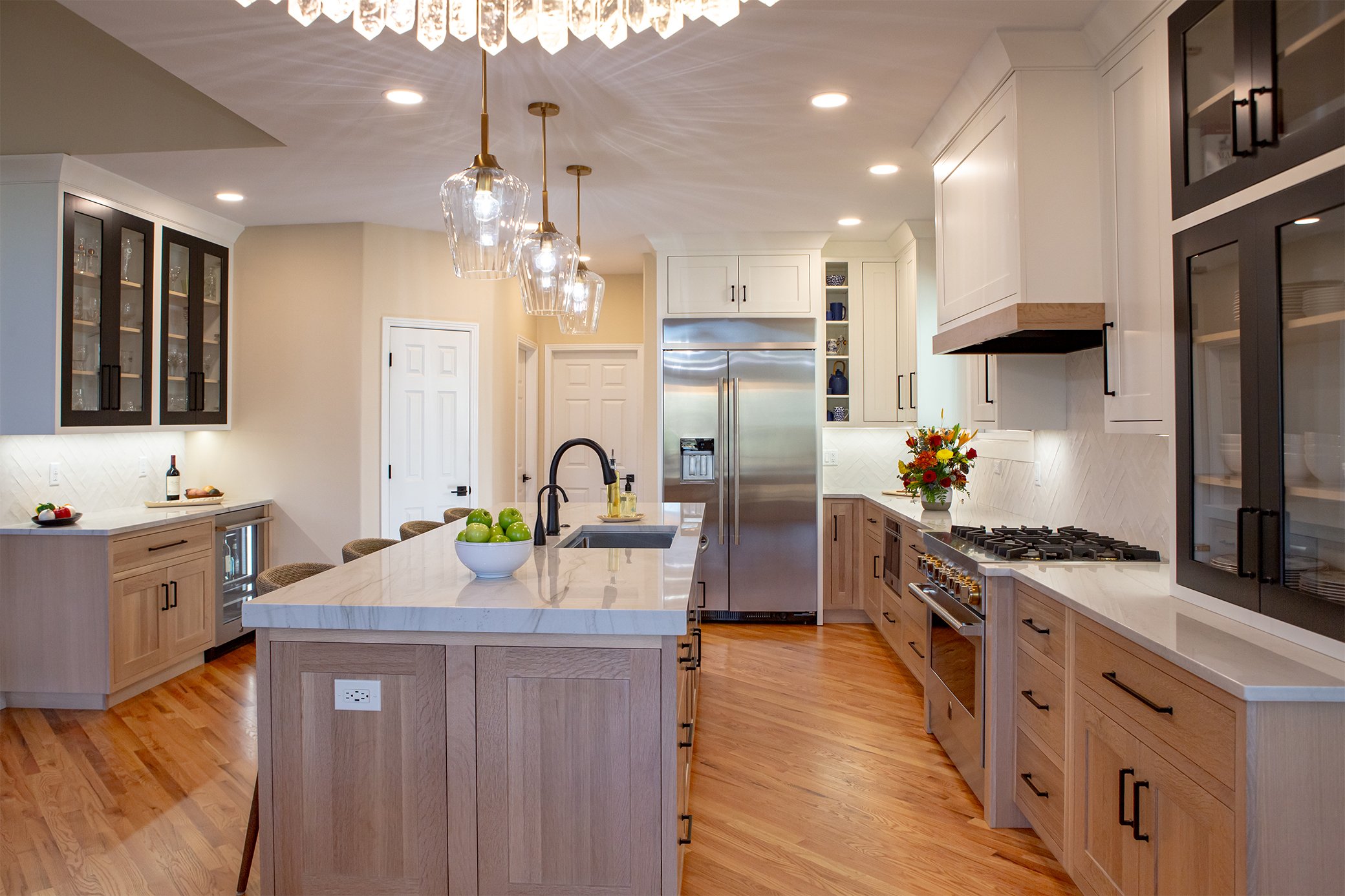 Maday explains that a “balanced work triangle” between the three main task areas—the sink, refrigerator, and cooktop spaces—is the key to functional design. Fill the areas between them with often-used items like dish towels, a knife block, salt and pepper shakers, and high-density cabinetry. Greenwood Cabinet specializes in maximum storage features such as deep drawers, rollout shelves, spice/knives/utensils drawers, recycling/trash pullouts, USB outlets, dimmable undercabinet LED tape lighting, and extra-deep wall cabinets that help keep your kitchen clutter-free. Having a specialized place for every tool in your collection also helps streamline the clean-up process and sets you up for future success.