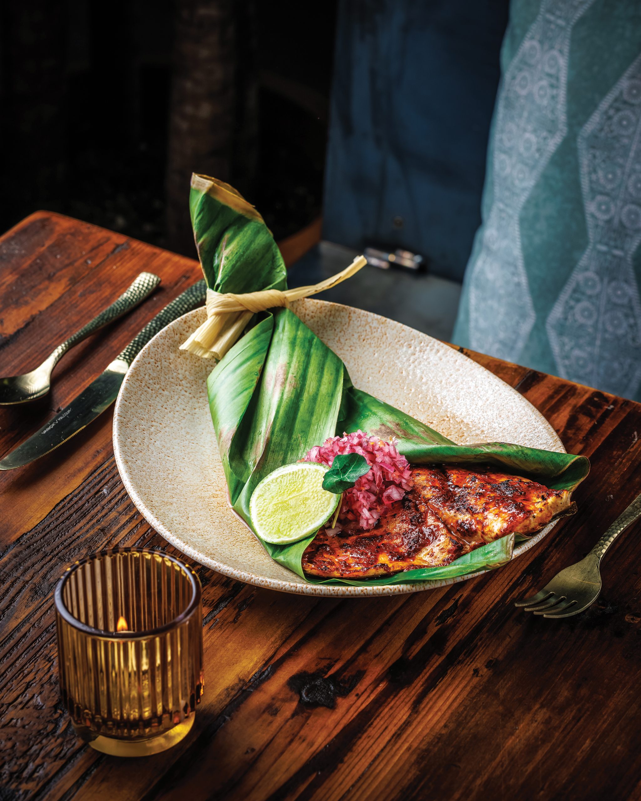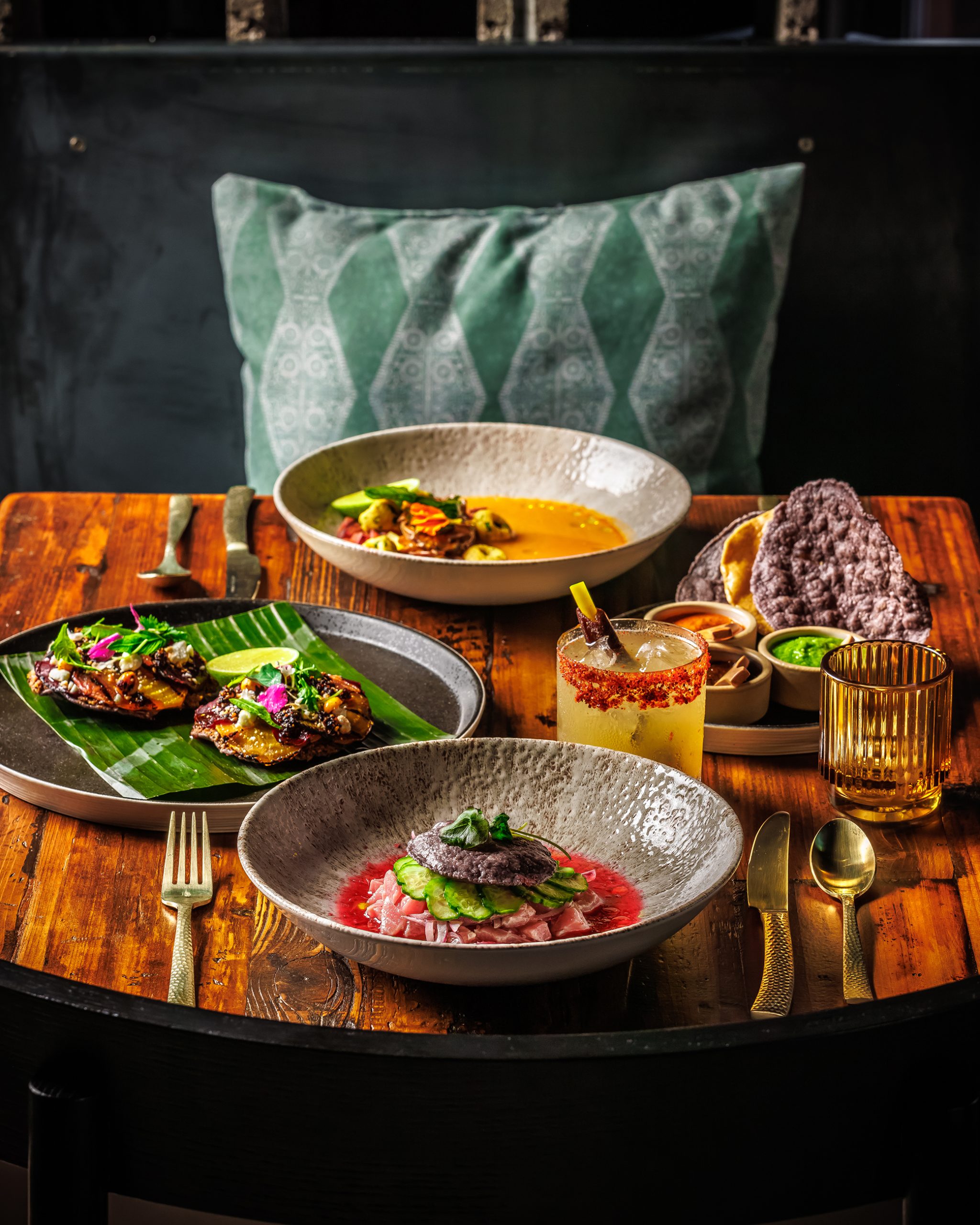 Moving into the taco (masa) portion of the menu, the Taco de Pato, featuring tender duck and a flavorful mole, and the Taco de Pescado with kanpachi from Hawaii, are both innovative takes on tradition. Main dishes here are meant to be shared, and the Tikin Xic—a flavorful pompano, the catch of the day, wrapped in banana leaf with pops of pineapple and xnipec, a spicy sauce native to the Yucatán peninsula, made with habanero pepper, purple onion, bitter orange juice, and salt—is a pleasure to pick off the bone. Ask for a side of salsas whose shades range from glowing atomic orange to milder greens and browns. The drinks here are just as thoughtfully crafted. The Chamoyrita is a playful concoction, served with an upside-down Modelito and a chamoy candy-adorned straw. The Margarita de Tomatillo offers subtle tomato flavors that blend seamlessly with the rest of the meal, while the Martini Cochinero puts a unique corn-infused twist on the classic for an easy-drinking delight.